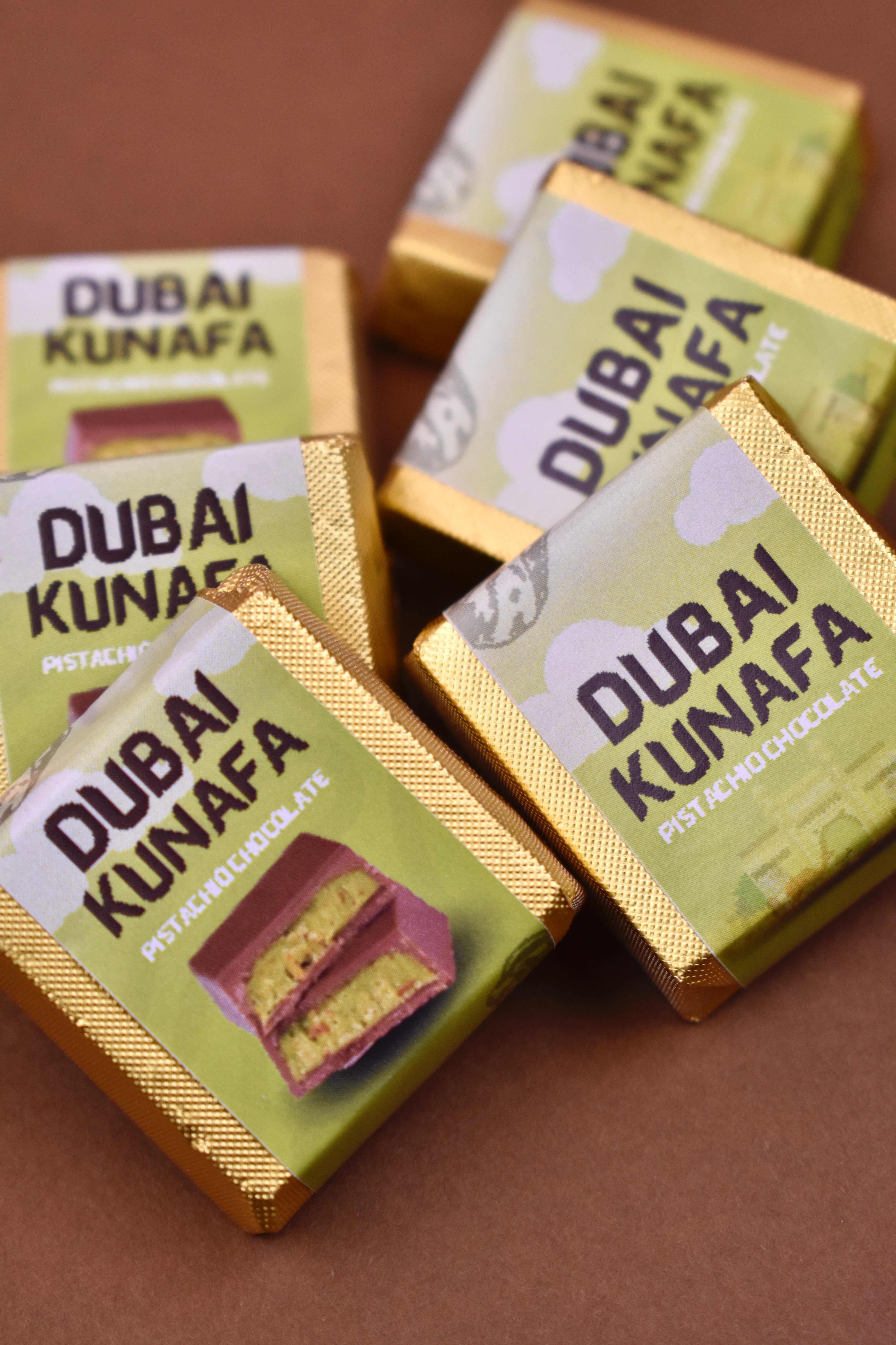 Dubai Kunafa Chocolate.A luxurious blend of creamy milk and rich dark chocolate, loaded with crunchy pistachios and par is 18 to 20 grams. A perfect fusion of Middle Eastern sweetness and chocolatey goodness!